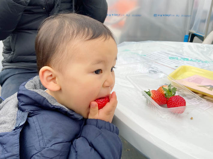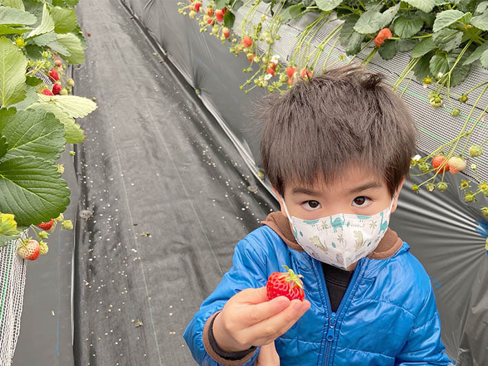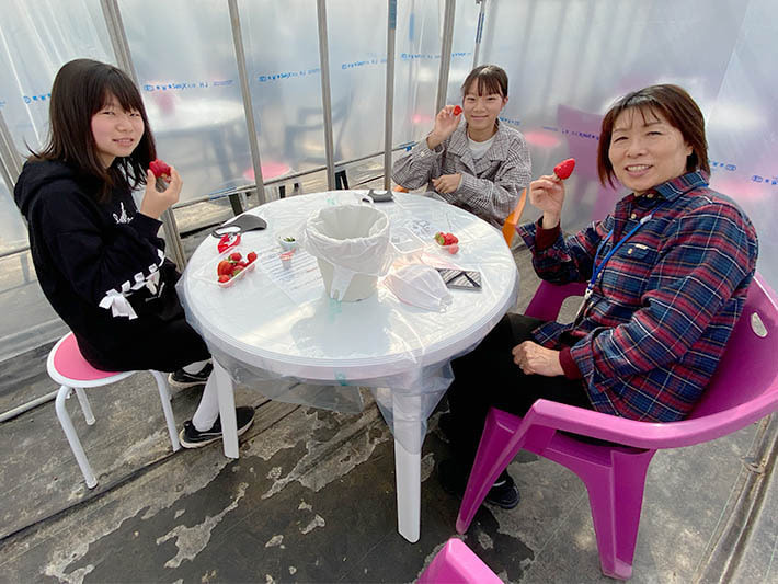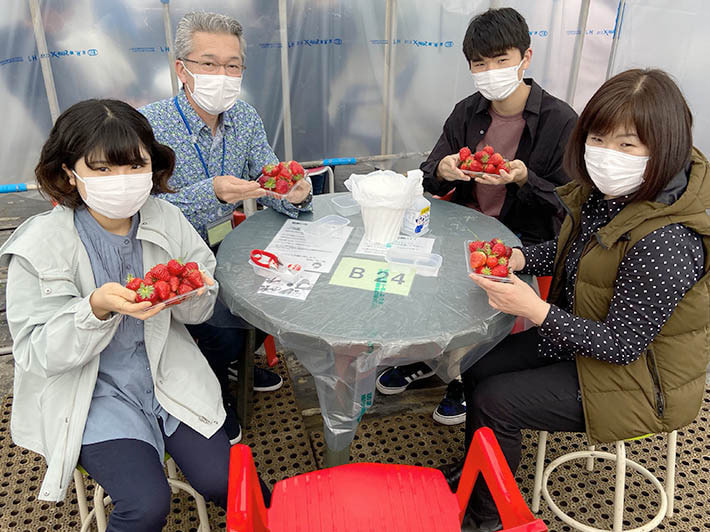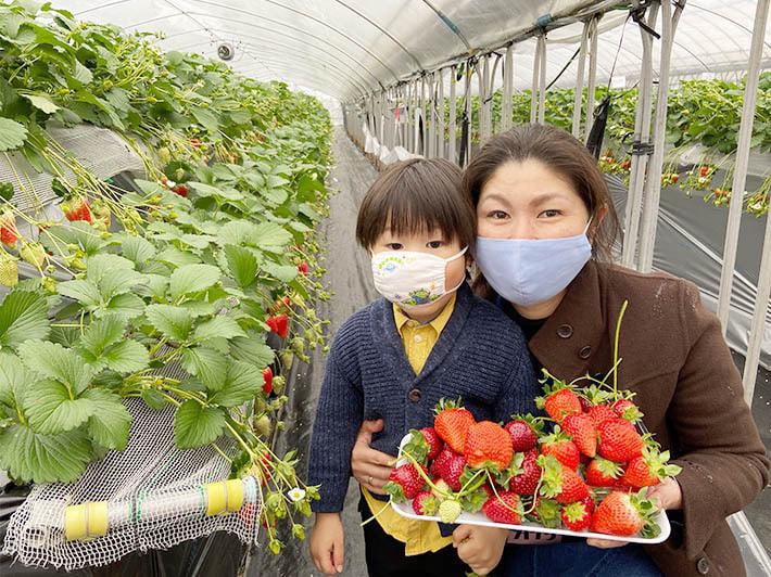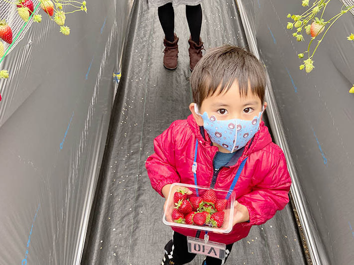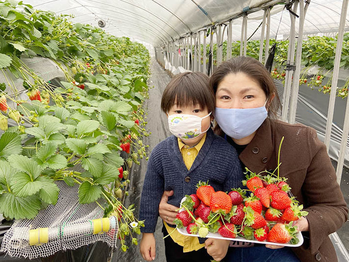 ハウスの方ですが、今年からマスクを着用して苺をトレイに摘み、ご用意した席に戻って食べるという流れです。もちろん、各所に消毒用のアルコールも準備してありますし、ハウス内は大型換気扇とサーキュレーターで十分空気の入れ替えが行われています。安全面に配慮し、できる限りのコロナ対策を行っていますので、外出を自粛されている方も、苺狩りを楽しんで気分転換していただけると幸いです。