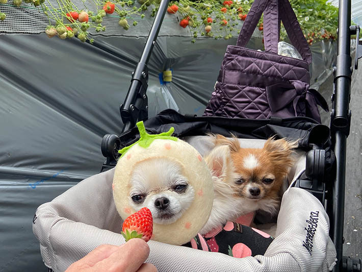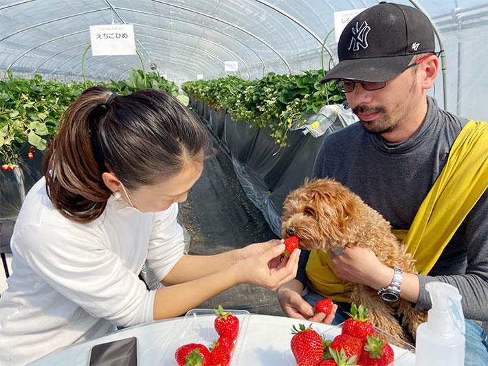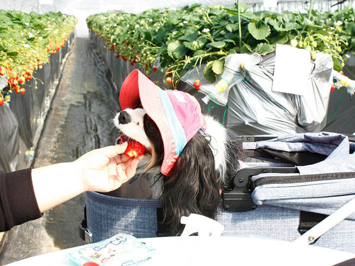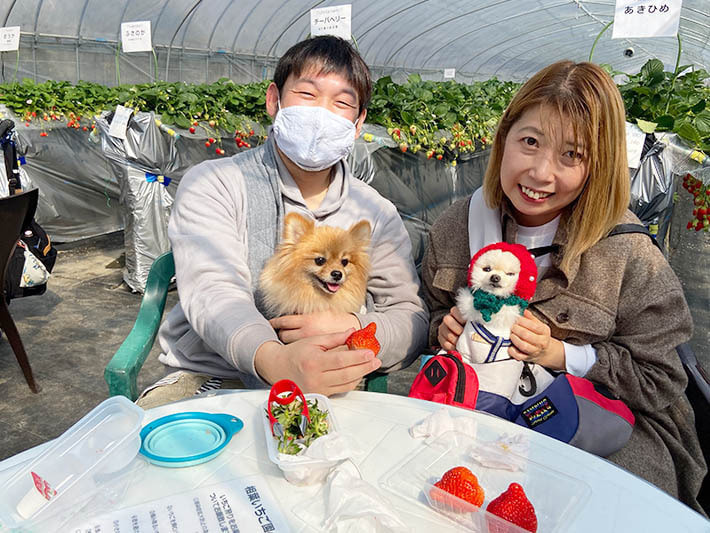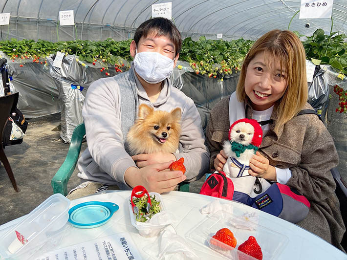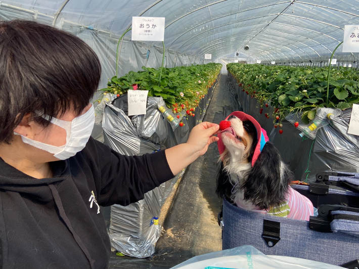 この日はペット連れのお客様の写真を多く掲載しました。撮影していて、わんちゃんと飼いさんは家族なんだなと実感しました。今後、ペット連れで楽しむお客様が増えるようであれば、今は苺狩りを楽しむ方法の1アイデアですが、今後定着して行くようであれば、ほかの苺園にも広がっていくかもしれませんね。