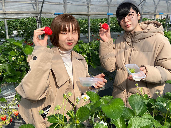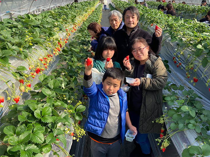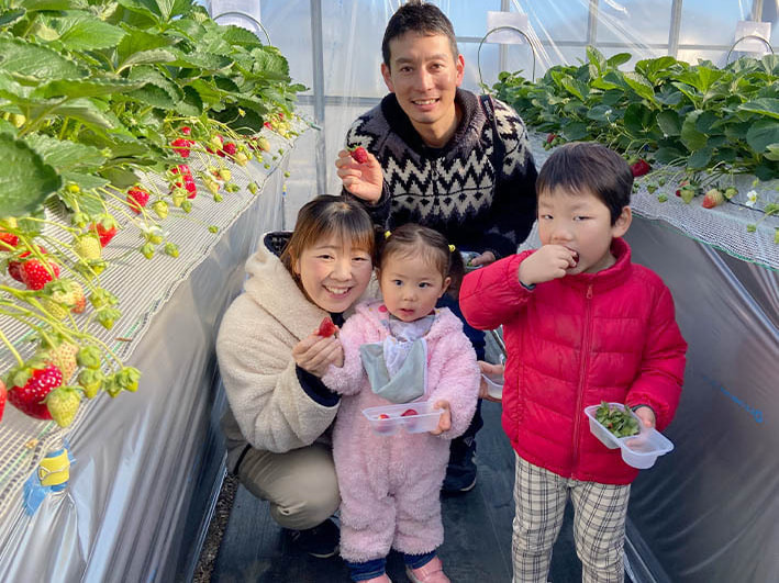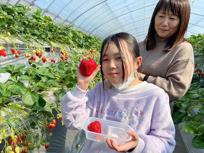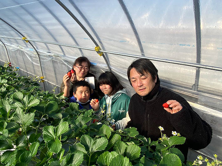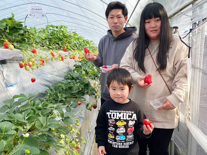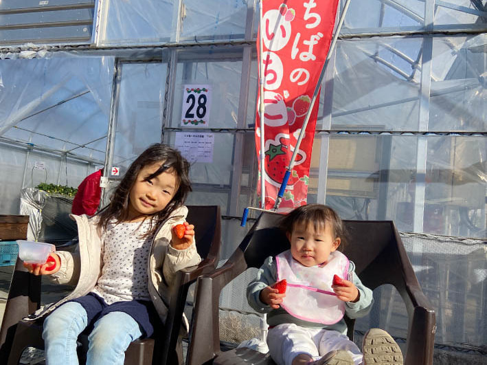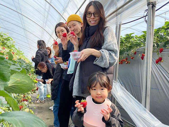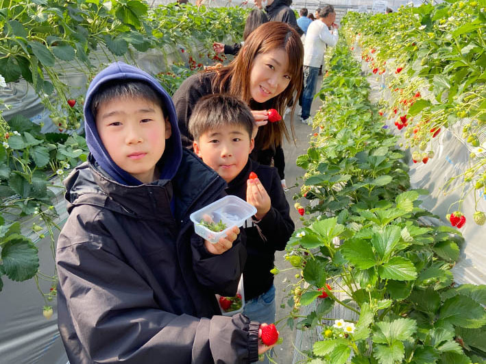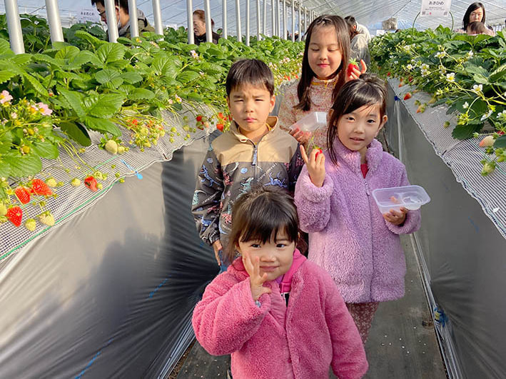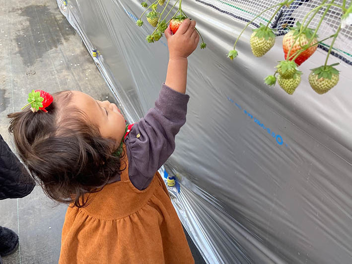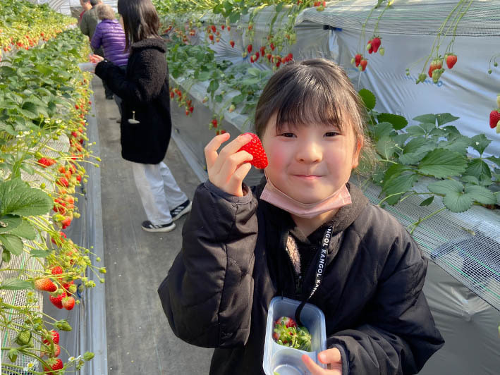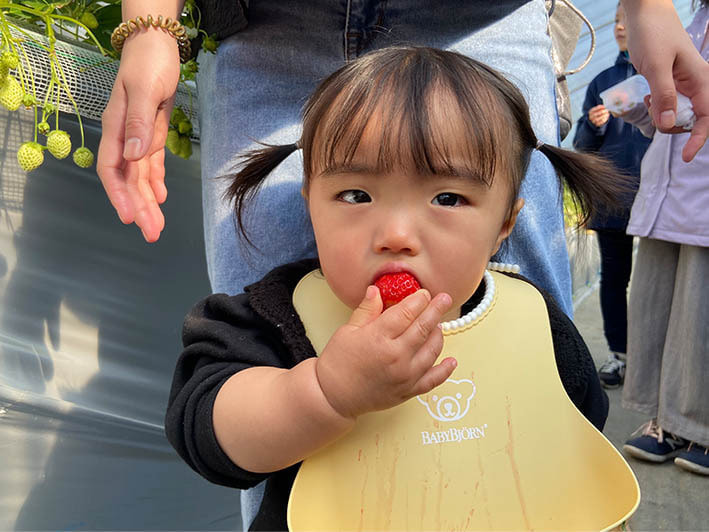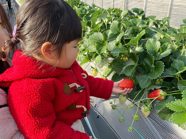 この日はミツバチも元気いっぱいで活躍していました。これから暖かくなるにつれてミツバチも活動的になって苺も増えてきます。ハチを怖がるお子様もいらっしゃいますが、怖がって叩いたりしなければ刺さずに飛んでいきますので、ハチが苺の受粉を手伝って実ができる事なども含めて、この機会に教えてあげてくださいね。