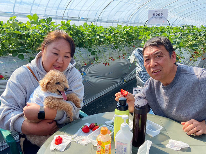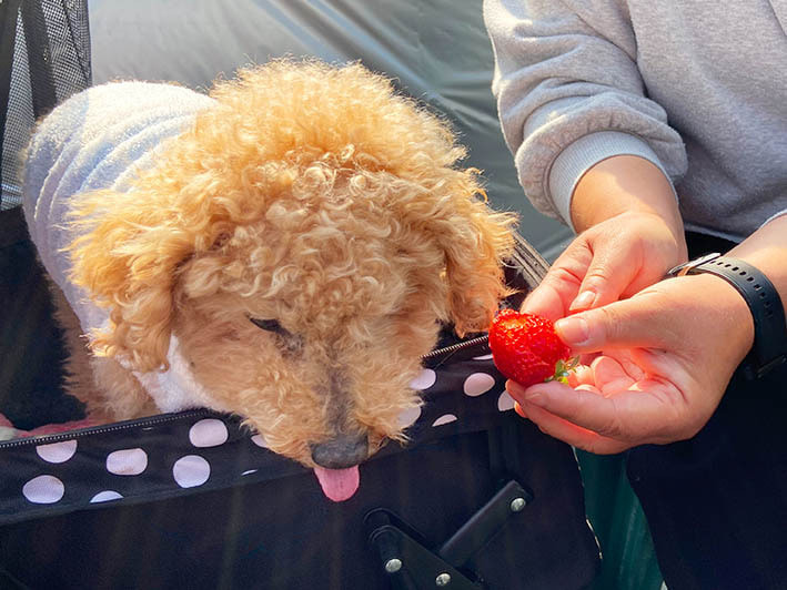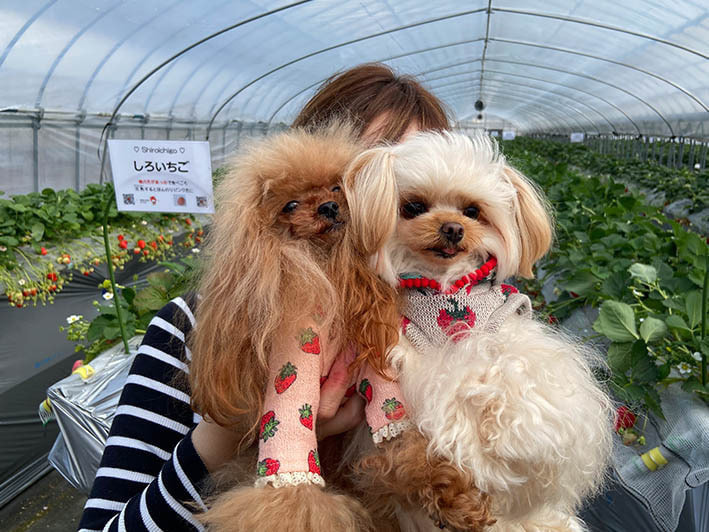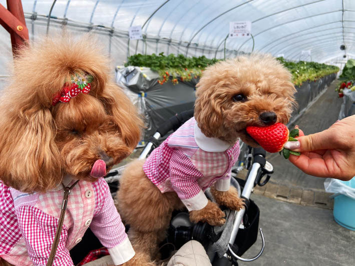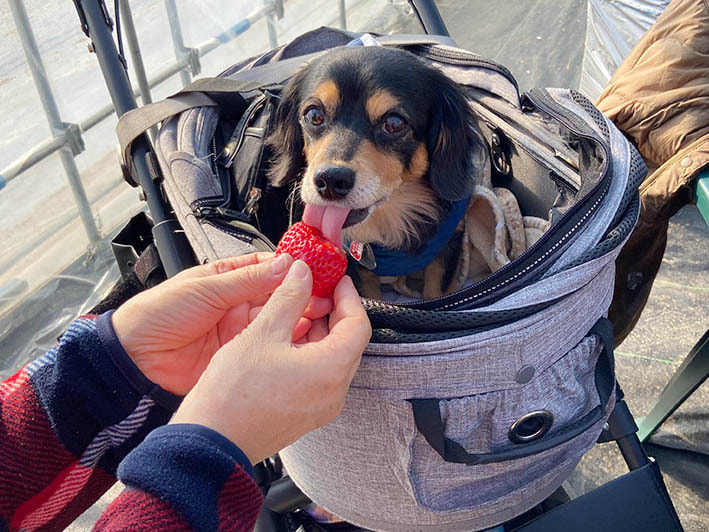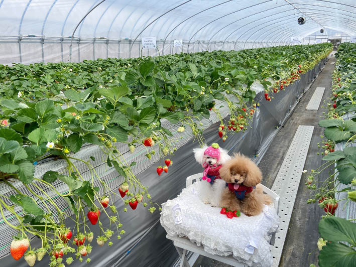 ペットと苺狩りのプランでご来園いただくお客様も段々増えて参りました。かわいくおめかししたワンちゃんが苺を嬉しそうに食べる姿は、見ていて楽しくなりますね。きっとワンちゃんにとっても、飼い主様との楽しい思い出になったのではないでしょうか。